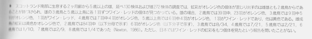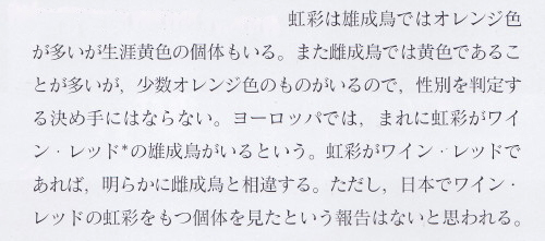 | 体下面の色 | ♂成鳥にほのかに赤い個体がいるが、あまり目立たない | ♀成鳥の一部と♂成鳥、幼鳥にかなり赤い個体がいる |