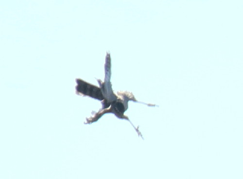 こういう急降下の時は一般的には体をロールさせたり、ハイタカ自身が制御できる範囲内の錐もみや体をずっと回転させる(同じ向きにロールを続ける)ことがありますが、今回も少し回転させていました(ぐるぐると回転し続けることはないです)。近くで撮影できればどのように小翼羽を利用してロールしているのか、降下途中で伸ばした両足をロールや微妙な体勢制御のためにどう使っているのかなどが分かりますが、今回は遠かったので画像が撮れませんでした。