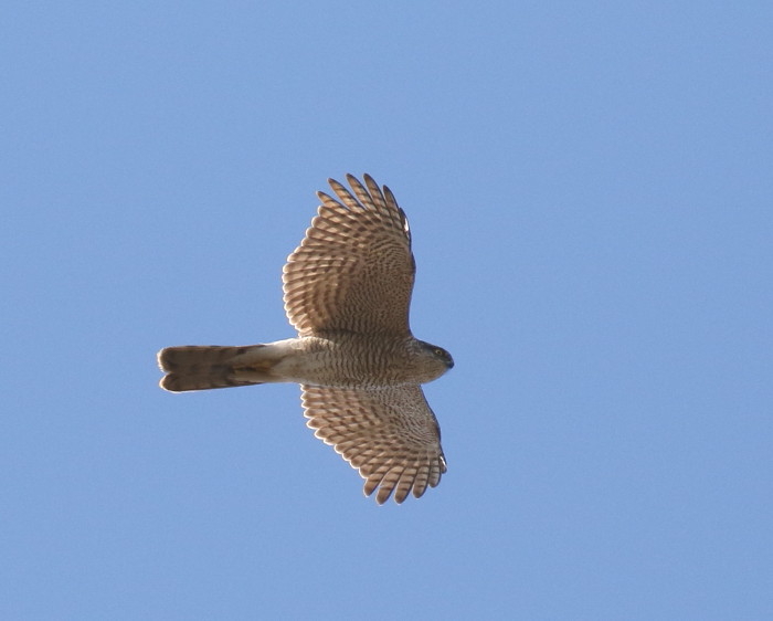 画像をじっくりと見れば、頭部や顔はハイタカMA、下雨覆と風切の鷹斑の幅の顕著な差もハイタカ、下尾筒の長さもツミよりはうんと長く、まさにハイタカです。P5がP4よりもかなり長いのも(オオタカにはない)ハイタカの特徴です。ツミの翼先に比べてハイタカの翼先は丸みがあります。翼先突出が5枚か6枚かということを除けば、あらゆる観点からどう見てもハイタカです。