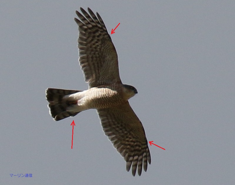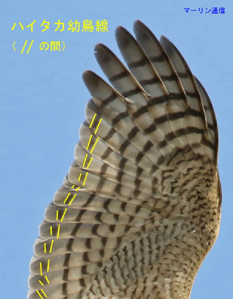 ハイタカ以外には考えられないのですが、念のために wing-formula(翼式)を他のハイタカMA画像と照合してみました。すると、やはりP10がありませんでした。画像をよく見るとP10は伸長し始めたばかりでした(赤い短い矢印2本)。なお、小翼羽はこの羽よりももう少し内側にありますので、矢印の2枚は小翼羽ではありません。