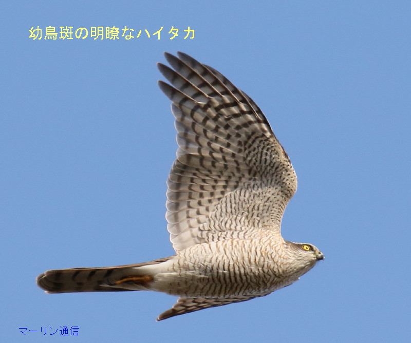この2点から、壷取りの(居ついた)ハイタカや、気象条件が悪くて渡りきれずに戻ってきた西行ハイタカとは明らかな違いがあります。