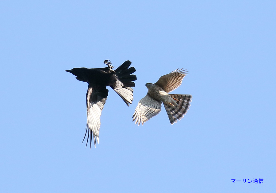 ハイタカがハシブトガラスやハシボソガラスと突っかかり合いをしているところをしばしば見かけます。この時、どちらがどちらに突っかかっているのでしょうか。最近観察した二つの地点でのようすを書いてみます。