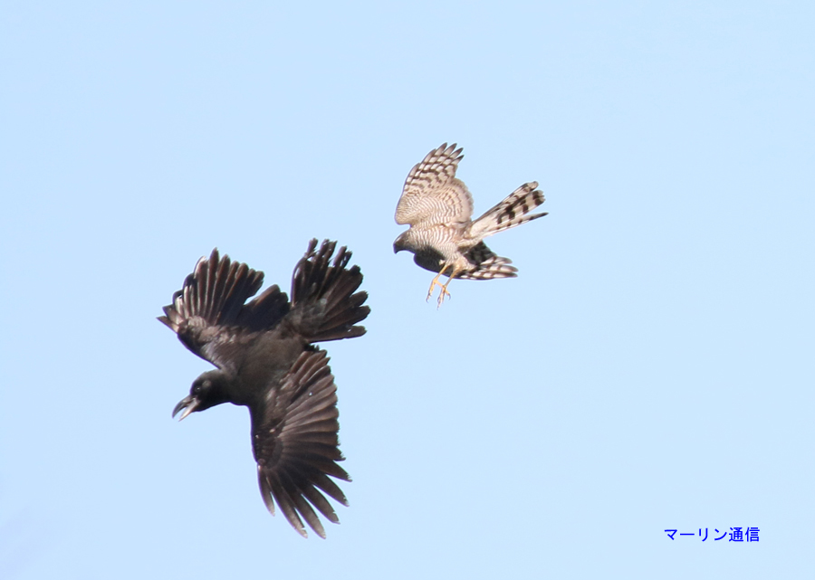 この二つの観察例から見ると、カラスは空中で獲物探索中のハイタカがじゃまだったようです。2月の例ではカラス自身の繁殖の時期が近づいていたことも影響があるかもしれません。カラスはじゃまなハイタカを排除しようと出てきたと思われます。一方のハイタカも獲物探索のじゃまをされたくないのでカラスを排除したようです。つまり、カラスがハイタカを強くしつこく排除しようとするので、ハイタカもカラスがじゃまになり、逆ギレしたようにカラス以上にしつこく強くカラスを排除することになります。