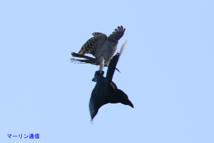 ③ ハイタカがカラスを猛追し、くねくねくねくねと飛びながら、時々カラスが背面飛行になったり、次はハイタカが背面飛行になったりしながら降下してハイタカがカラスをジグザグに追いかけました。