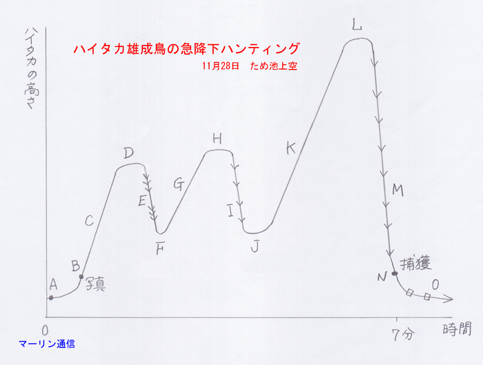 AからNまで、約7分間でした。双眼鏡でずっと見続けていましたが、一番高度が高い時は双眼鏡をいったん離すと再びハイタカを視野に入れることが難しいほどの高空まで上がりました。7分間双眼鏡を見続けるというのはけっこう長い時間ですが、がんばって見続けるということが大切です。ほとんどの人はタカが小さくなってきた時点で双眼鏡から目を離したり、カメラの液晶で画像を確認したりしますが、そうするとタカがどこにいるか分からなくなって、探しても2度とタカを捉えることはできなくなり、今回のような狩りの瞬間を見ることもできなくなります。ハンティングの一部始終を見たい人、捕獲の瞬間まで全部を見たいと思う人は、タカの姿が完全に見えなくなるまで双眼鏡から目を離さないことです。見続ければ見える確率はかなり大きくなります。