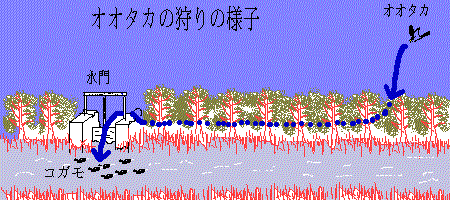 1994年3月6日午前7時50分頃のことです。鍋田の弥富野鳥園東の水門近くにコガモが10羽ほど集まっていたので、近くで見ていたら野鳥園の池の上空にオオタカ成鳥が現れました。ところがオオタカは急に高度を下げ、すぐに見えなくなってしまいましたので、またコガモを見ていたら、突然水門の鉄の横棒と鉄の縦棒の間から現れてコガモを襲いました。降下してから水門の間を抜ける直前までのオオタカの飛行ルートは樹林帯の陰になって見えませんでしたが、その短い時間を考えると、下の図の点線のようなコースしか考えられません。樹林帯を遮蔽物のように利用してコガモに近づいたようです。