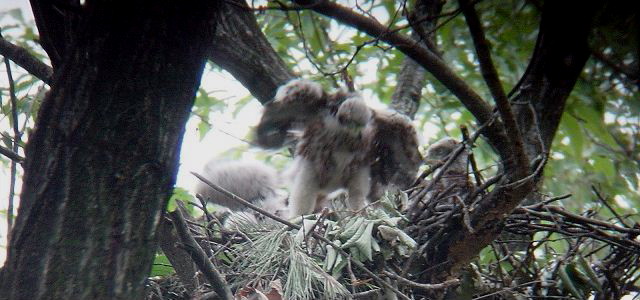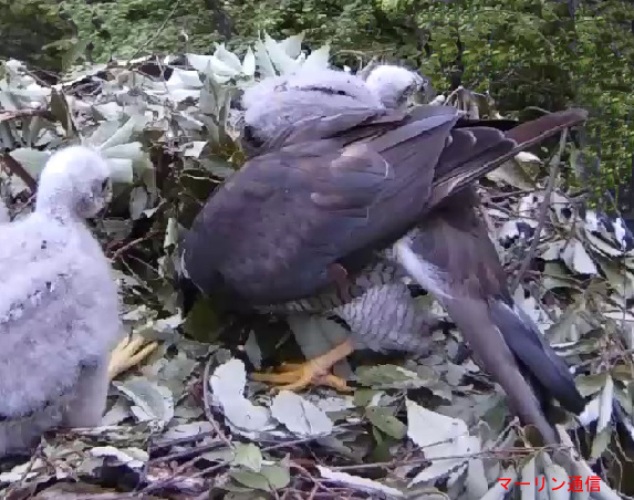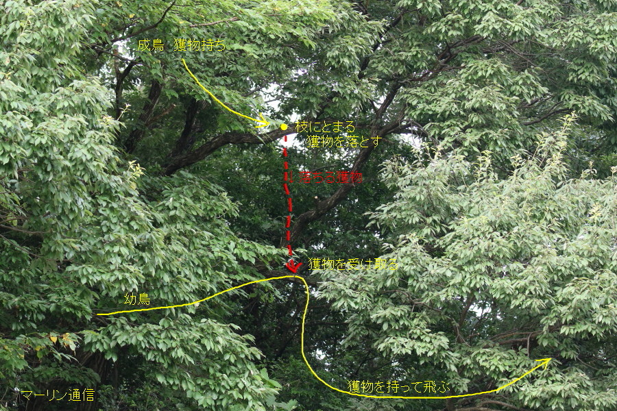 7月の最後だというのに、さかんに鳴いて獲物をねだっていて、今日は親から獲物をもらうところを見ました。その受け取り方がちょっと珍しかったので、詳細を書きます。