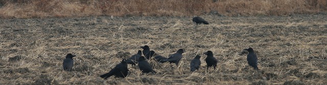 カラスはハシブトガラスで、小鳥はムクドリでした。この時すぐ近くの電線にとまって鳴いていたムクドリ6羽がさらに大きな声で鳴いて大騒ぎをしながら、カラスの後についていきました。オオタカがムクドリ幼鳥を捕った時とほとんど同じような光景でした。