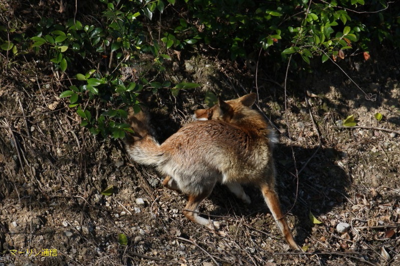 するとどうでしょう、その直後ほんの3秒程後に別のオオタカ幼鳥が、さらにその直後5秒後にノスリが両足を伸ばしてその林の中へ急降下していきました。あっけにとられているといつの間にか西の空にトビが3羽出て旋回しています。私もびっくりしながら、同じタカ仲間のような気になって、林の中にヤブコギしながら入っていきました。ピォゥーと鳴き声が近くでしましたが、近寄り過ぎたようで、飛び立たれてしまいました。
