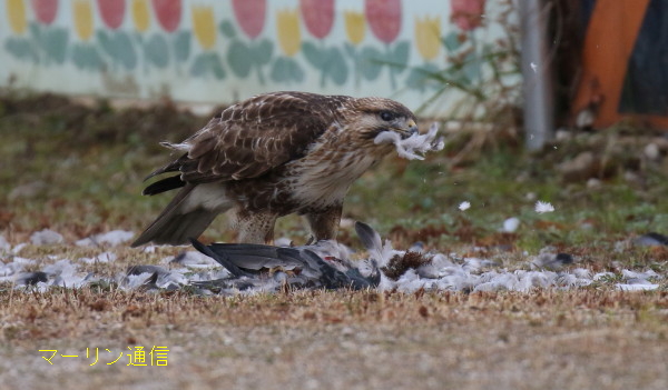 そこにはドバトの羽と、まだ固まっていない血痕がありました。羽毛をむしり少し食べただけで場所を移動したようです。今この原稿を打っているパソコンのある部屋からたった70mの所でした。最近オオタカを自宅近くでよく見るようになりましたが、これはドバトが増えたことと関係が大きいような気がします。