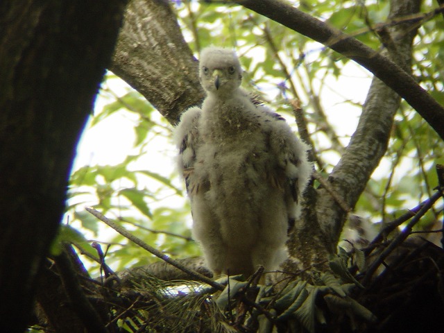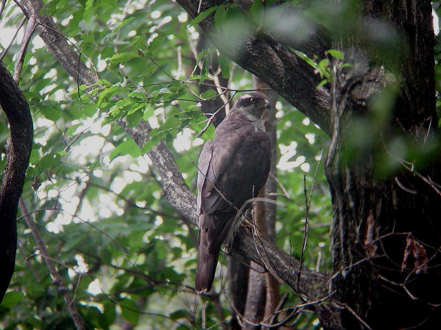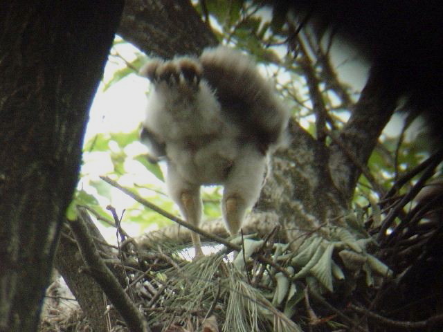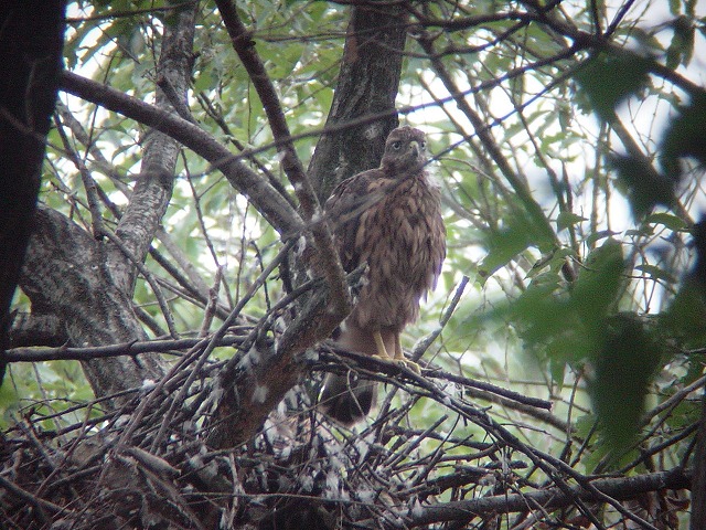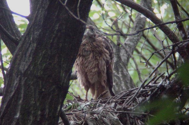 今日の幼鳥は十分に自由に飛ぶことができました。近くを飛んだドバトの小群8羽を追いかけたり、ツミ幼鳥にしつこくモビングされた後で、逆にそのツミを激しく追いかけたりしていました。ハンティング能力がどの程度なのかよく分からなかったですが、飛ぶことや枝にとまることは支障なく十分にできます。
