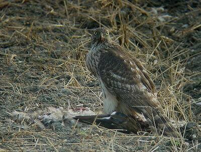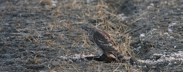 車を道路脇にとめて、ふと目線を左下にやると、近くで、何かかたまりが動くのが見えました。双眼鏡でのぞくと、オオタカの♀幼鳥でした。しかも、大きな獲物を足でしっかりと押さえています。抜いた羽毛が一面に広がっています。干拓地へ到着して、ほんの3分以内の幸運。一日中ねばっても何も見つからない日があるのに、こんなに早く、こんなに近い距離で見つかることもあるものですね。