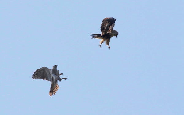 一昨年、オオタカ幼鳥の捕えたドバトをノスリ2羽が横取りして食べてしまったことをこの通信のノスリフォルダーの記事に書きましたが、この日も最後までの確認はできなかったものの、やろうとしていたことはまったく同じ横取りでした。オオタカにとってノスリはやはり大きな脅威です。