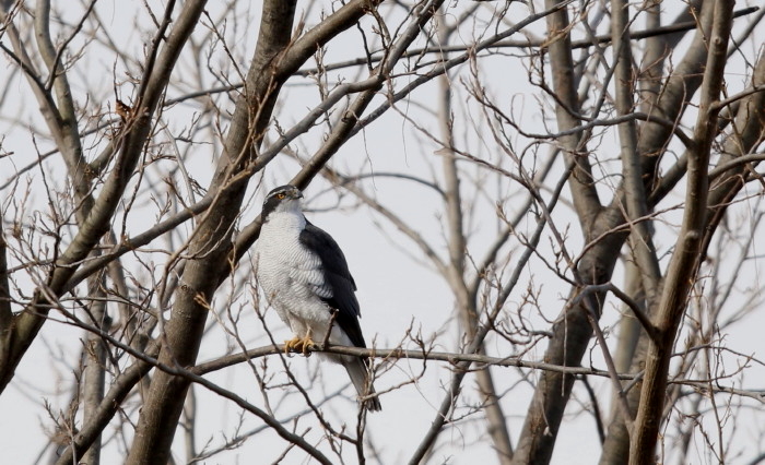 この日は曇っていて陽が差さず、空の一部に晴れ間が出るもののほとんどはベたっとした曇り空でした。10時過ぎに急速に晴れ間が広がりだして、木の枝にとまる雄成鳥に光が当たり青空バックで感動的な美しい姿を見ることができるようになりました。その時のオオタカの背中の色は美しい青灰色で、コチョウゲンボウの雄成鳥か、ハイタカの雄成鳥の背中の色に近いくらい似ていました。オオタカを「蒼鷹」(あおたか、おおたか)と書く理由がストンと心に落ちました。
