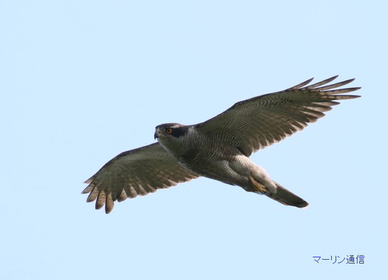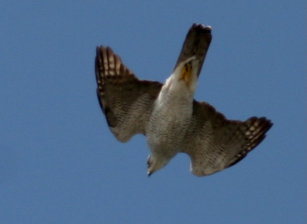 頭の真上くらいになってからカメラのシャッターを切ったので、少々後ろ姿(見送り写真)になってしまいましたが、写真を撮ってみて、唖然としました。肉眼では、過眼線が淡色に見えて、各羽の斑は淡く少なく、かなり淡色だったのですが、写真で見るとぜんぜんそんなことがありませんでした。