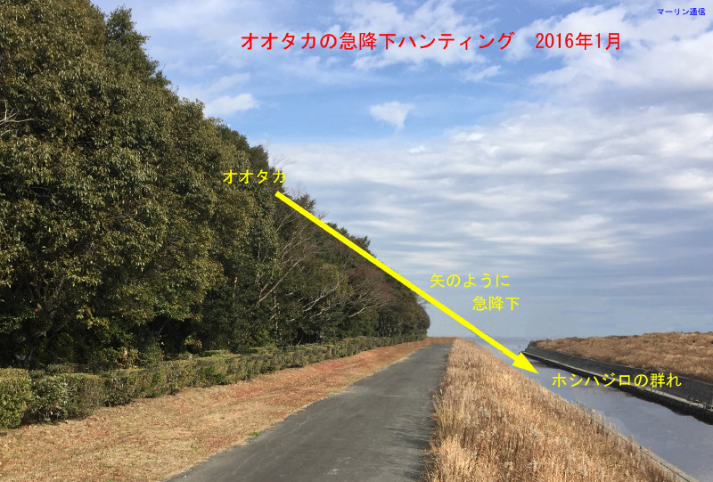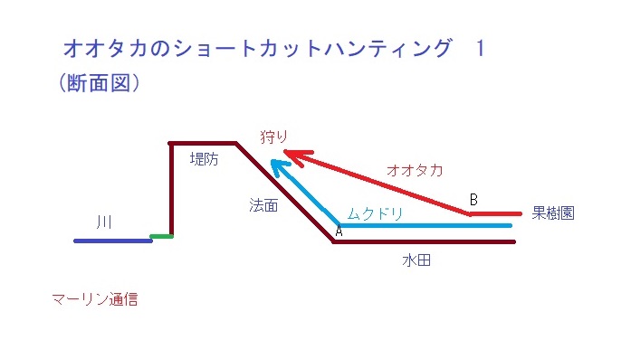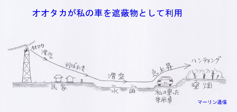 また、秋に田で刈り取った稲をぶら下げてある稲架を遮蔽物のように使って、獲物の前に突然ヌッと現れたオオタカ成鳥を観察したこともあります。