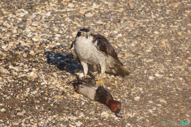 1時間ほど、食べるところや休養しているところに付き合っていましたが、8時17分、東方へ飛び去りました。現場へ行ってみると、カモは翼鏡が青色をしており、その先端が白い帯になっていましたので、マガモの雌と判断しました。半分以上食べられていました。オオタカが飛び去った後には、すぐにハシブトガラスが集合して、次々と引っぱり合いをしながらお掃除をしてくれました。