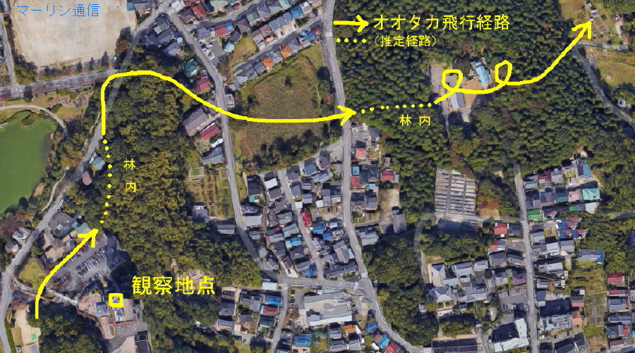1993年12月5日午後3時頃、自宅母屋の応接間で餅を食べていたら、離れのテレビアンテナのすぐ脇を成鳥のオオタカが何かをつかんで飛びました。高さもアンテナほどの低さです。慌てて飛んだ方向へ走り10分ほど捜し回りましたが見当たらず、とりあえず家に帰ると、隣の家のおばあさんが「裏の畑に鳥の羽がちらばっとるよ!」とのこと。