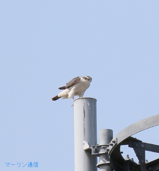 5月、オオタカ雄成鳥が頻繁にとまる鉄塔に、1羽のオオタカ成鳥がとまっていました。私はほぼ真下近くから上を見るような角度で見あげていました。肉眼で見ると雄くらい小さく見えて、雄のように頭でっかちに見えて、雄のように体下面が白かったので「いつもここにとまるのは雄だからこれも雄だろう、雌は今の時期抱卵中だから……」と思って双眼鏡を使わずに見ていました。