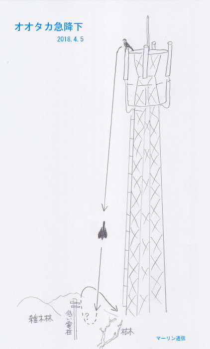 鉄塔上からのこの声を聞いて、私は「えっ、雄もあんな雌のような激しい声を出すんだ」とびっくりしました。オオタカ雄は雌と比べればやや弱い声で、私には「キャッ キャッ キャッ ……」というよりもどちらかというと「キッ キッ キッ キッ ……」に近いような、少し音程が高く、細い声に聞こえます。でも繁殖期真っ盛りでしたので、「時期が時期だからね。それとも私を排除したいのだろうか?」と思いました。