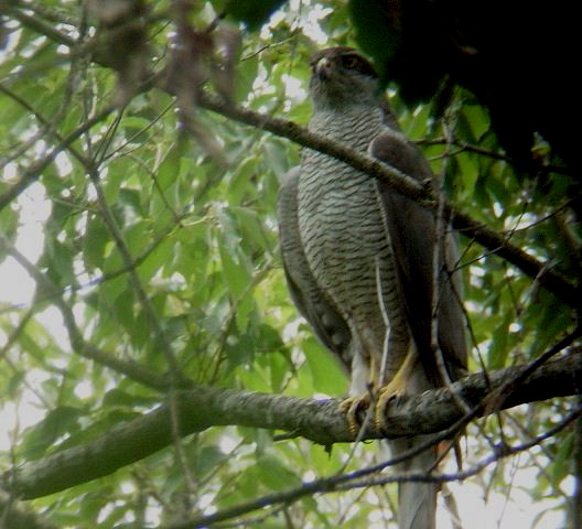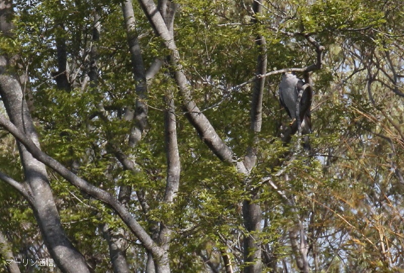 ハヤブサやチュウヒが頻繁に行う空中獲物渡し(一般には「空中餌渡し」と言われる)によく似ていますが、そんな開けたところではなく、林内で、しかも一本の茂った大きな木の中で行われました。