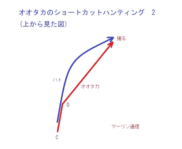 オオタカがハトの直近まで来た時にハトが一斉に飛び立ったので、オオタカはそのままハトの群れに突っ込むことができず、群れの近くでほとんど垂直に近いくらいの急上昇をして、じきに垂直急降下をしました。もしも図中のAのあたりにハトがいれば急上昇せずにそのまま捕らえることもありますが、この日のハトは見事に瞬時に飛び立ちました。獲物の近くで急上昇・垂直急降下するという狩りは、まさにコチョウゲンボウの狩りそっくりです。あるいはハヤブサの狩りにも似ていて、降下する高度がハヤブサほど高くはないものの、急降下するところはハヤブサの狩りに少し似ています。このオオタカは急降下の直後、体を水平にするころ(どこかで体を水平にしないと地面に激突してしまいます)ハトを捕えました。