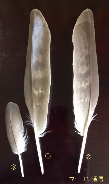 さて、今の私たちアマチュアにはたくさんの標本を調べたり、新たな標本を手に入れたりすることはできませんので、できることは高精細な画像を撮ってそこから換羽状況を分析することです。換羽した後の新羽は見るからに新しく新鮮で色合いも旧羽とは異なります。旧羽は紫外線や羽と羽あるいは羽と空気、羽と樹木などとの擦れで色が抜けたり、羽軸が折れたり羽枝が欠けたりして傷んでいることが多いです。高精細で撮った画像を調べればその羽が新羽か旧羽かはだいたい分かります。新羽でも生えてきたばかりの新羽は色がさらにきれいです。さらに、幼鳥から成鳥に換わる途中の換羽は旧羽である幼羽が褐色味を帯びているのに対し、新羽である成羽は灰色味が強いので、両者の色の違いが明白で新羽と旧羽の違いがかなり正確に分かります。したがって、換羽順の研究では生後1年少々を経過した幼鳥が成鳥に変わる時期(幼羽から成羽に換わる時期)が一番適しています。