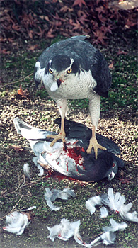 1995年1月8日午前11時35分。尾張旭市内の雑木林近くの田の畦道でぼんやりと空を見ていた時のことです(いつでも鳥を見に行く時はぼんやりとしてしまう)。私の向かって左後方から一羽のドバトが飛んできました。ところがそのハトが急にフラフラとしたのです。一瞬ハトが目まいを起こしたような印象を受けました。その瞬間、右方向からオオタカの成鳥が現れ、私の目の前で両足を大きく伸ばしてドバトを捕り、林の中へスーッと入っていきました。