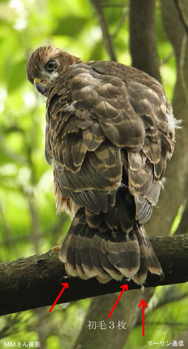♂はヒナが巣にいるころが一年の中でいちばん多忙な時期で、次々に獲物を捕らえて巣に搬入する必要があります。そのため、狩りに一番大事な役目を果たす風切羽や尾羽を抜落させてハンティング能力を落とすわけにはいきません。一方で、♀は♂と違って抱卵中にどんどん換羽を進めていきます。♂が獲物を捕らえて運んできてくれるので狩りに出かける必要がないからと考えられます。巣に長時間ずっと座り続けて抱卵していますので、その間にある程度の換羽が進みます。愛知県では(個体によって進み具合がもちろん違いますが)5月上旬までには多くの♀成鳥はP1・P2の新しい羽がほぼ伸長済みで、P3が半分ほど伸長中、P4は抜け落ちているかどうか、尾羽はR1がほんのわずかですが伸長し始めるという個体が多く見られます。