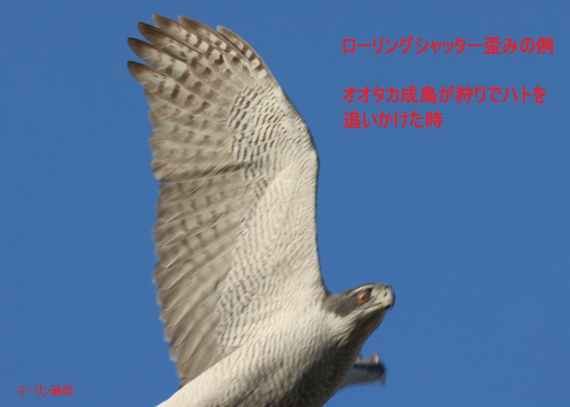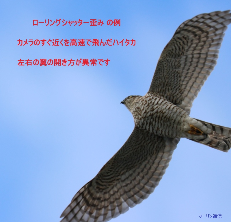 この先カメラがさらに改善されて電子シャッターでも歪みがなくなればよいのですが、今の状況では私はメカシャッターか電子先幕シャッターしか使えません。初めからローリングシャッター歪みを覚悟のうえで電子シャッターでコマ数を多くして撮ってみればよいのですが、小形タカ類がロールしたり背面になったりすることはしょっちゅうあるわけではないので、そんな低頻度のことを念頭に置いていつも電子シャッターで超高速撮影するとなると、他の写真に悪影響が出てきてしまうのでなかなかできません。
