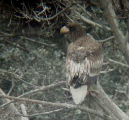 数年前、この池にオジロワシが来たことがあります。その時のオジロワシは、カワウの巣の下に落ちている魚を拾って食べるところを何回も見かけましたので、細々と生きているという印象でした。ところが、今回のオオワシは、カワウの親を無理やり巣から追い出し、抱いていたヒナを巣の上で食べてしまいました。偶然このことを観察し、証拠写真を撮ることができました。下の写真はフィルム写真です。日没直前で完全な逆光でしたので、かなりベールをかぶったような画質で、おまけに暗くてピントも甘いのですが、なんとかその様子が見えると思います。左と右の巣は同じカワウの巣です。営巣木の枝とその向こうに見える横向きの枝をくらべてください。ヒナをオオワシに捕られる前に、たまたま、同じ巣をカメラに納めていました。夕方5時22分、オオワシは巣の中で激しく抵抗するカワウの親を追い払い、巣の中に入ってそのヒナを食べ始め、くちばしが真っ赤になりました。食べ終わるのに約30分かかりました。ヒナの数ははっきり分かりませんでしたが、少なくとも2羽を食べるところまで確認できました。