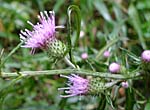 「散策路図」の1番付近から3番付近にかけて、スズカアザミが咲き始めました。 湿原内で見られるキセルアザミと異なり、一株に多数の花をつけます。 |