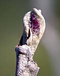湿原内やその周辺にはハンノキが多くあり、その雌花序が熟し始めました。(画像左) 自分の花粉で受粉しないように、雄花序が熟し終わってから雌花序が熟し、他の個体の花粉が飛んでくるのを待ちます。 植物の工夫には感心させられますね。 画像右は、その冬芽です。この状態で冬を越し、暖かくなると葉が展開します。 それぞれの樹木によって、冬芽には大きな特徴があります。この時期は冬芽の観察も楽しいものです。 なお、この個体は「散策路図」の13番付近のものです。 |