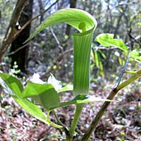 湿原周辺では、スルガテンナンショウが咲いています。 マムシグサの付属体は先端がこん棒状なのに対し、こちらは先端が鍵状にくびれているのが特徴です。 画像にその様子が写っていますが、お分かりでしょうか? 雌雄異株であるので、雄花・雌花を探して歩くのも楽しいものです。 |