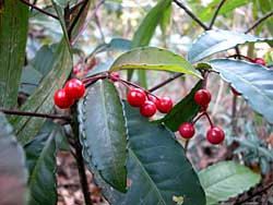 湿原内やその周辺では、多くの樹木が実をつけています。 画像はマンリョウの実ですが、他にもウメモドキ、センリョウ、ヤブコウジ、ソヨゴなどの赤い実が目立ちます。 |