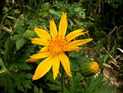 「散策路図」の3番付近(木道を挟んで反対側)では、ハンカイソウが咲き始めました。 黄色の大きな花は、緑の中で一段と映え綺麗です。 |