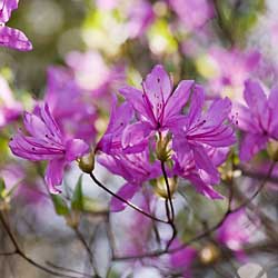 湿原背後の尾根では、ミツバツツジが咲いています。 これによく似たコバノミツバツツジも自生していますが、その雄しべは10本です。ミツバツツジの雄しべは5本ですから区別がつきます。 カタクリやヤブツバキも咲き、尾根歩きを一層楽しいものにしてくれます。 <P.12> |