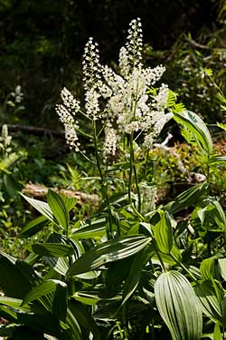 「散策路図」の1〜3番付近や5番の奧では、ミカワバイケイソウが見頃の状態です。 高山植物のコバイケイソウと近縁ですが、それに比べ花はまばらです。 また、花被片の縁は細かく切れ込み,その花被片より雄しべが長いのが特徴です。 <P.30> |