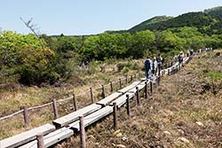 「散策路図」の12番付近では多くのモウセンゴケが咲いています。 真夏の暑い時期になると葉は元気がなくなってしまうので観察するには咲き始めの方が良いかと思います。 葦毛湿原には赤い花を咲かせる トウカイコモウセンゴケ もあります。 <P.56> |
