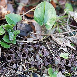 とても多くの花をつけているヒメカンアオイを見つけました。 ヒメカンアオイの萼筒はイワタカンアオイに比べ短く10mm程度以内です。 萼筒内側の格子紋はイワタカンアオイより粗いです。 シベは開口部付近に先端が位置します。 今年は、イワタカンアオイもヒメカンアオイも花付きが良くありませんというか、地上にでている葉が既に枯れてしまっている株が多く、花が見つけにくい状況です。 葉が多く残っている年だと簡単に見つかる程株数はありますので、観察はそんな年が狙い目です。 |