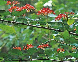 本州の関東地方以西の山野で見られる落葉小高木。 直径5mm程の両性花の周りに、直径3cm程度の白い飾り花をつける。 「散策路図」の丸数字1、3番付近で見られる。 林の中で、白い花が滝の流れのように咲く様子は清々しさを感じさせてくれる。 また、実の時期もまた美しいので見ていただきたい。 【平均開花時期 5月上旬〜5月中旬】